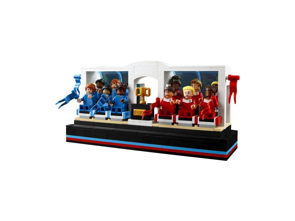 Vytvořte tu pravou atmosféru – Umístěte na stůl tribunu a zaplňte ji minifigurkami. Budete mít k dispozici 2 fotbalové míče, trofej a vlajky