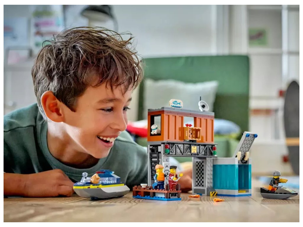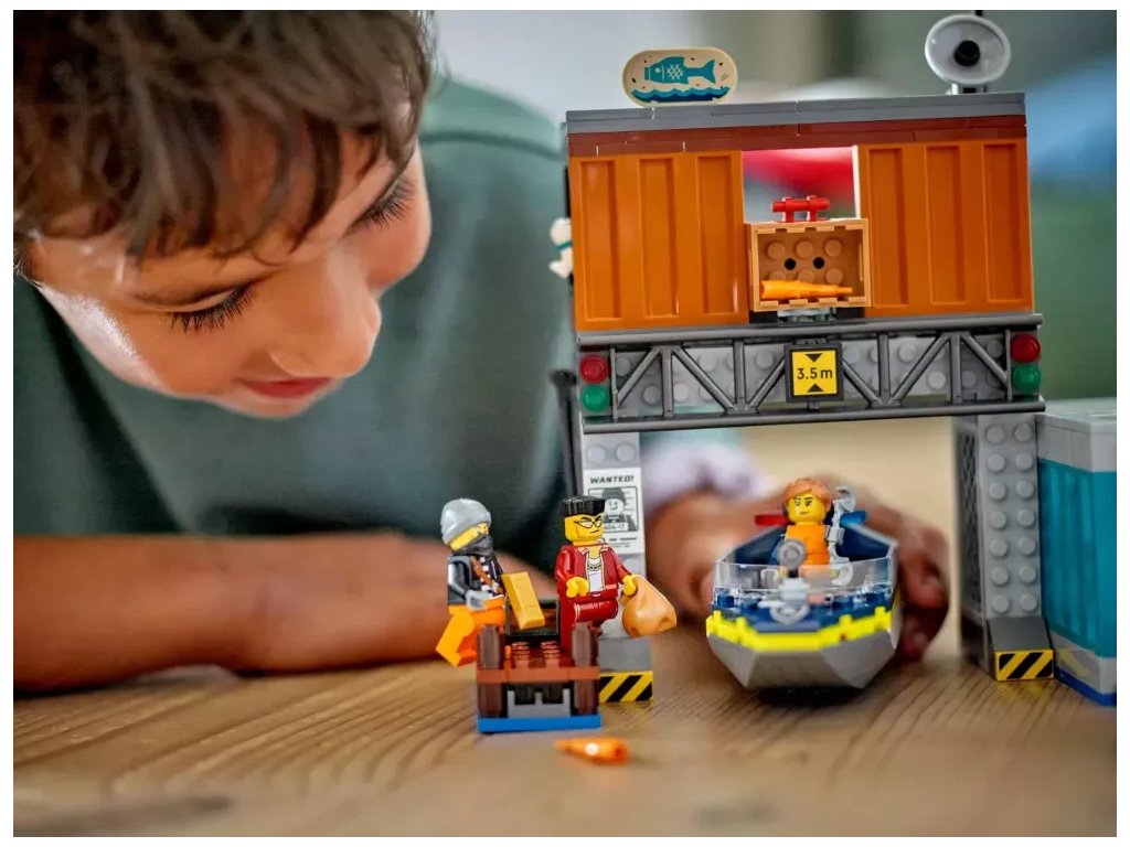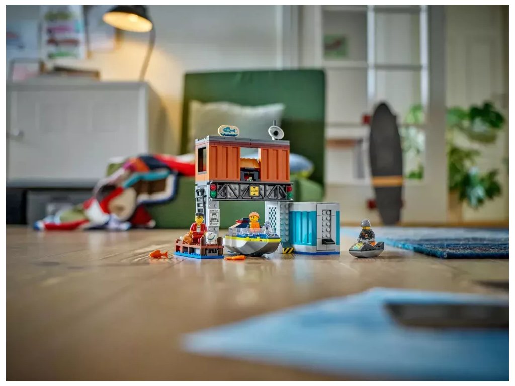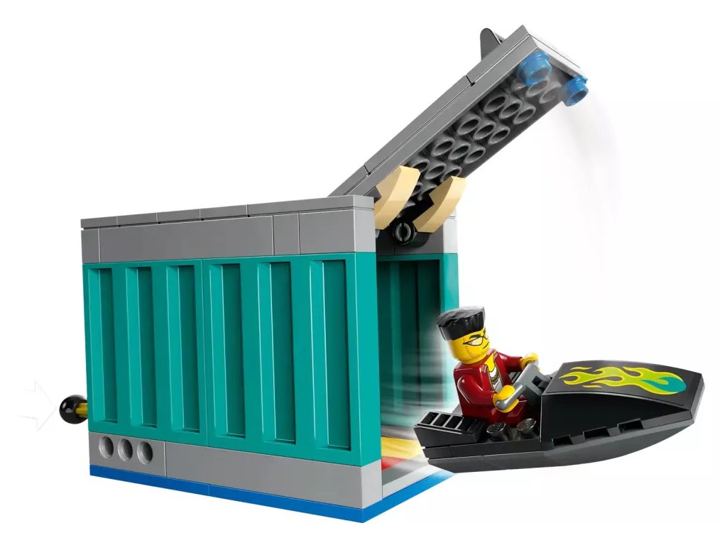 - Co je v krabici? – Vše, co děti potřebují pro sestavení motorového člunu, vodního skútru, doků s nákladními kontejnery a minifigurek policisty, 2 zločinců a figurky buldoka