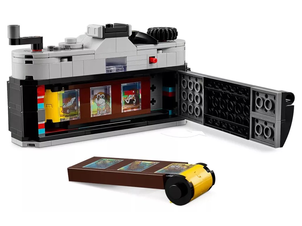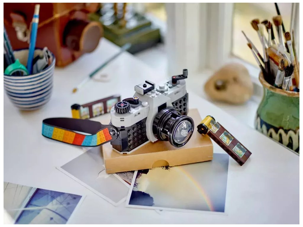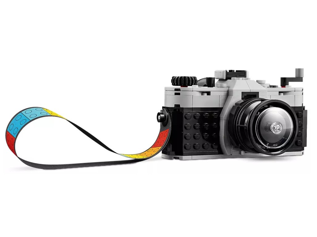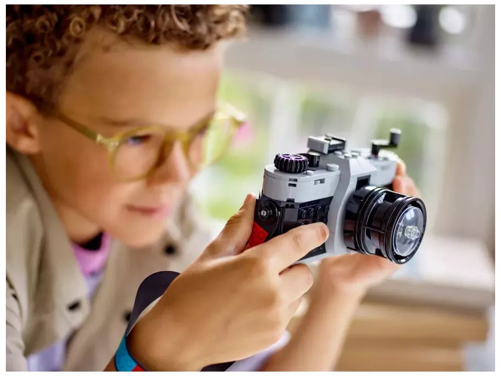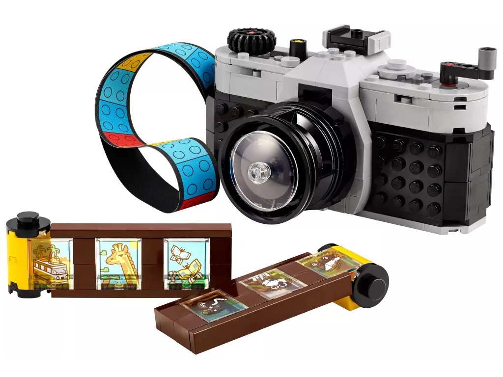 Inspirujte děti od 8 let k nápaditému hraní se stavebnicí LEGO® Creator 3 v 1 (31147) Retro fotoaparát. Model fotoaparátu má pohyblivý objektiv, na horní straně najdete tlačítka k pořízení fotografie a vzadu je otvor, do kterého můžete umístit film z kostek a barevný textilní pásek na nošení. Součástí je také 6 samolepek, které představují fotografie a děti je nalepí na jednotlivá filmová políčka.
