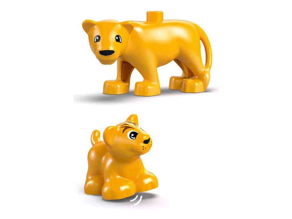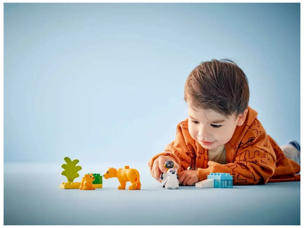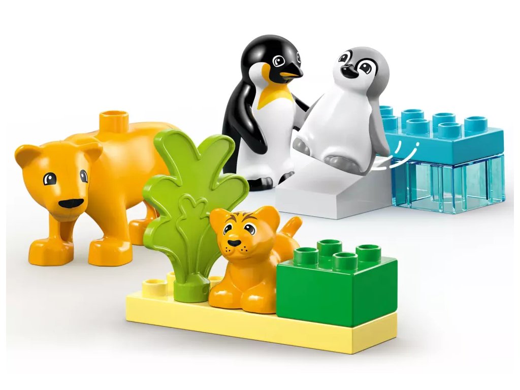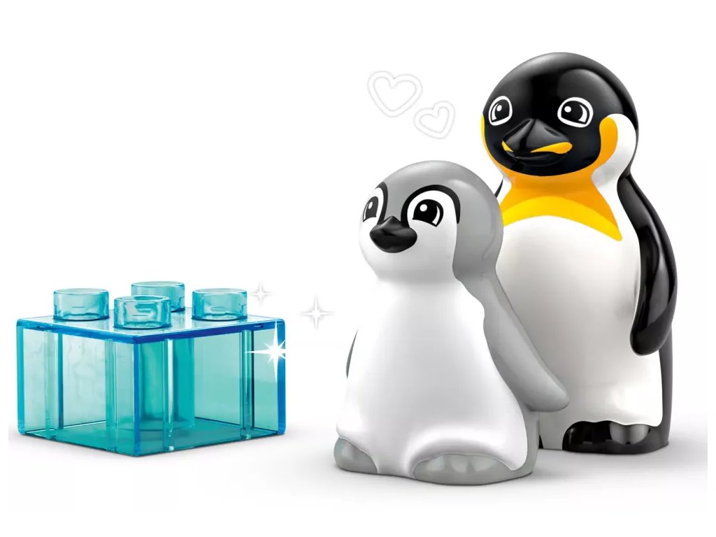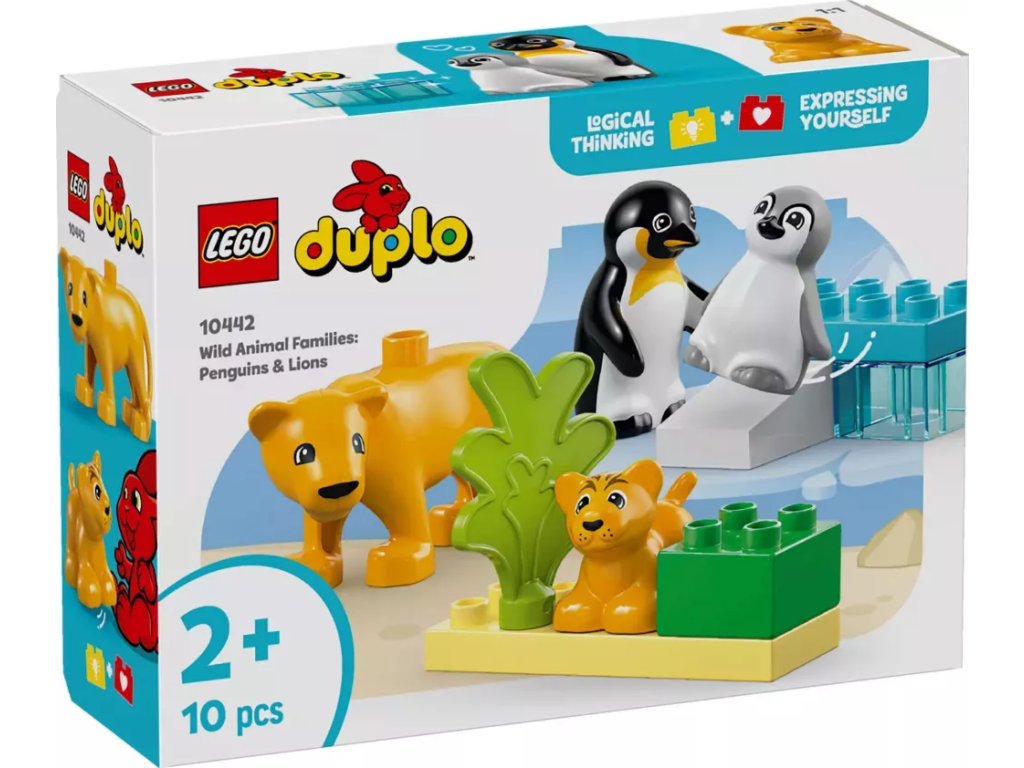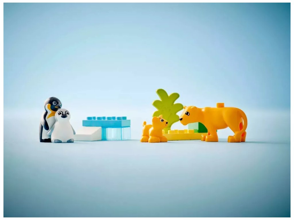 - Hračka s tučňákem a lvem pro děti – Součástí této stavebnice jsou 2 biotopy z kostek a 4 figurky zvířátek LEGO® DUPLO®: Dospělý tučňák s mládětem a lvice s lvíčetem