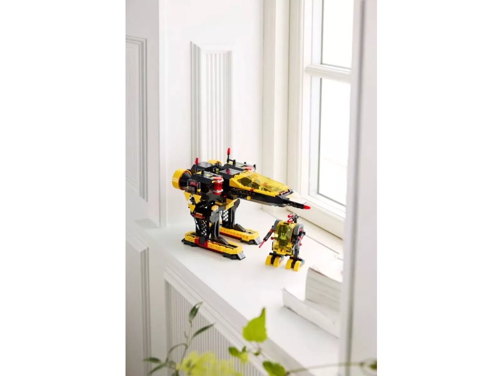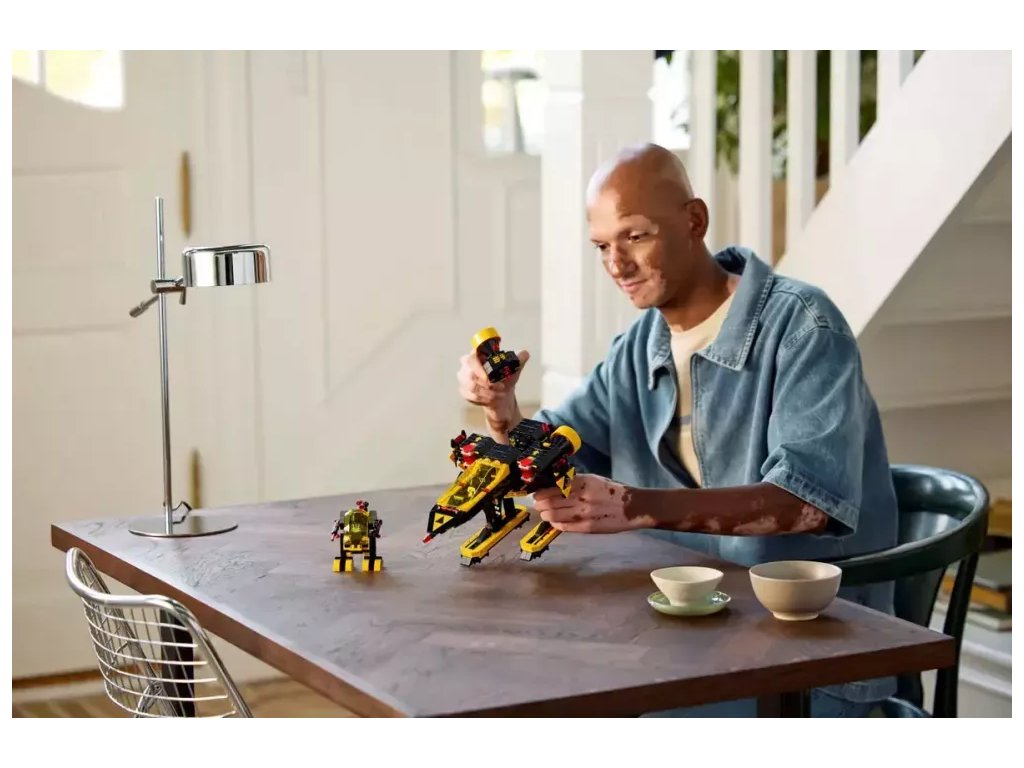 - Přestavte model na Alienator – Součástí je tištěný návod na sestavení Blacktron Renegade a v aplikaci LEGO® Builder najdete 3D návod, kde se dozvíte, jak model přestavět na Blacktron Alienator z 80. let