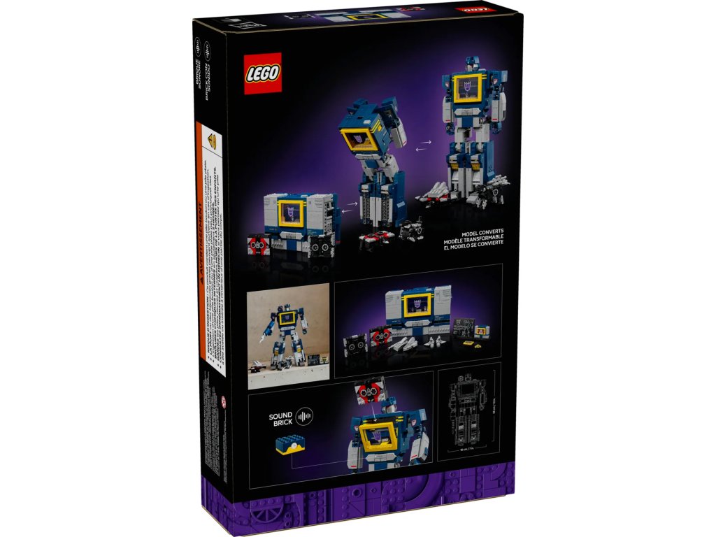 - Co najdete v krabici? – Vše, co potřebujete k sestavení propracované figurky LEGO® Icons Transformers: Soundwave s raketovým podvozkem, laserovým blasterem a šipkami, a figurky Ravage a Laserbeaka