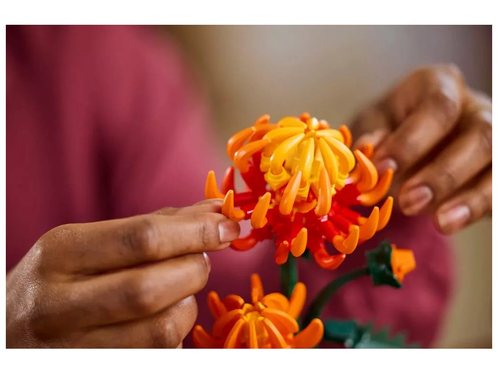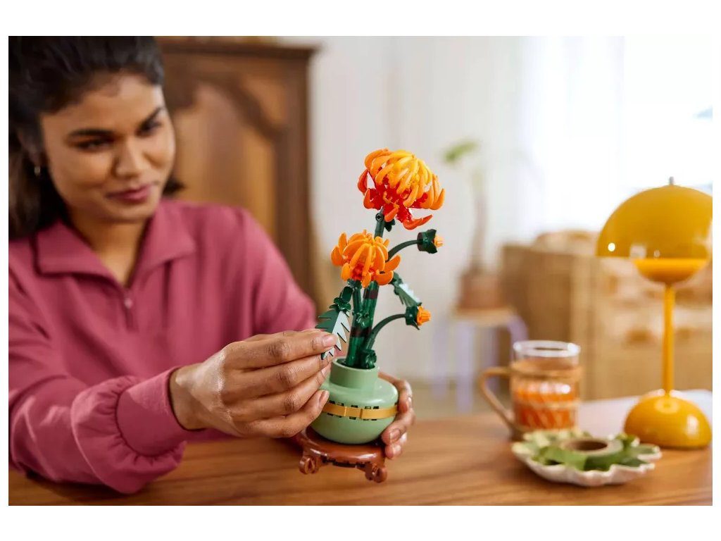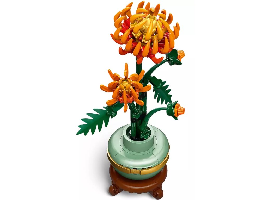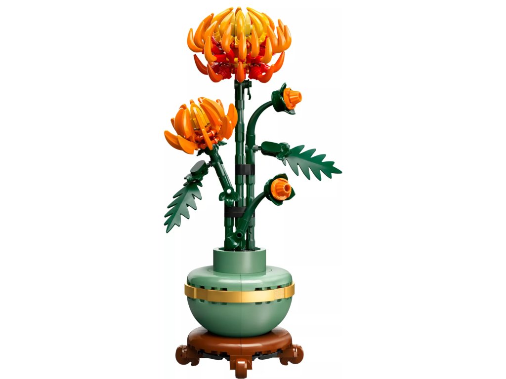 Tato propracovaná replika s polohovatelnými listy a okvětními lístky představuje zářivě oranžový květ v různých fázích kvetení – poupě, kvetoucí květ a květ v plném rozkvětu. Součástí je také pastelově zelený květináč zdobený zlatým páskem, který je umístěný na podstavci s efektem dřeva. Model chryzantémy se snadno sestavuje, představuje elegantní ozdobu každé místnosti a bude se skvěle vyjímat vedle dalších stavebnic z botanické kolekce LEGO (prodávají se samostatně).
