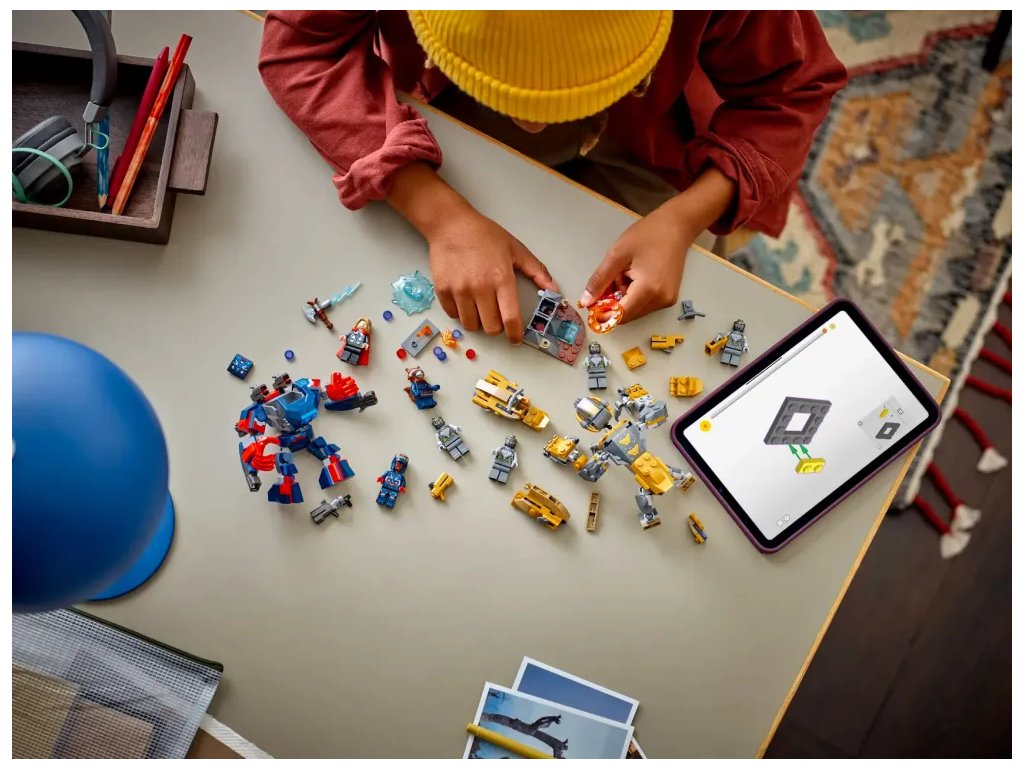 - Doplňky pro akční dobrodružství – Mezi další prvky patří 2 skútry a malý model prostředí pro minifigurku Thora, kam můžete uložit náhradní střely