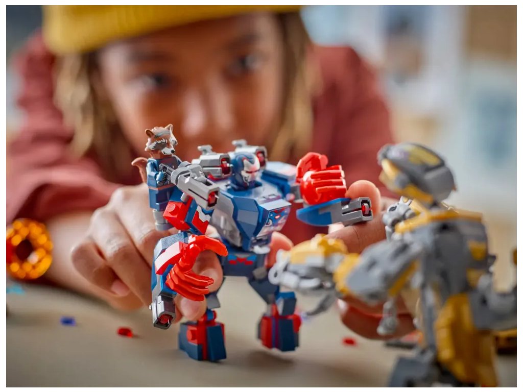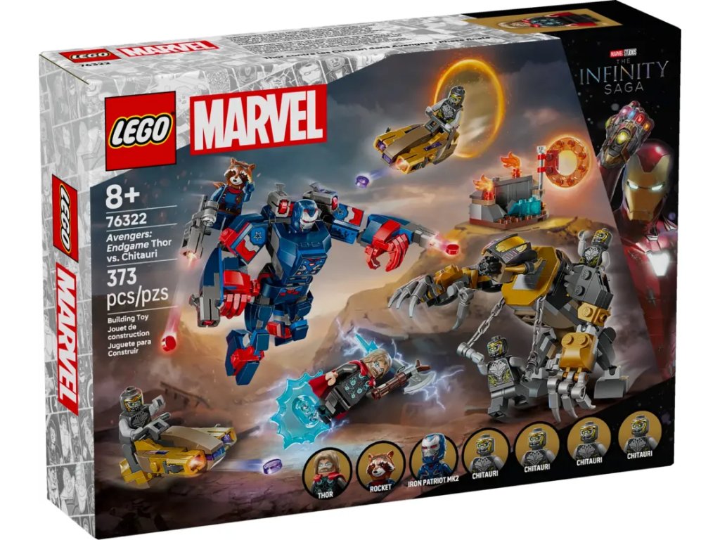- Minifigurky LEGO® ǀ Marvel – Součástí je 7 minifigurek: Iron Patriot MK2, Rocket s velkým vystřelovačem, Thor se Stormbreakerem a 4 Chitauri, z nichž 2 mají zlaté vystřelovače