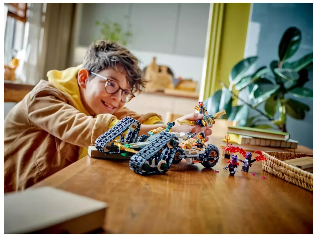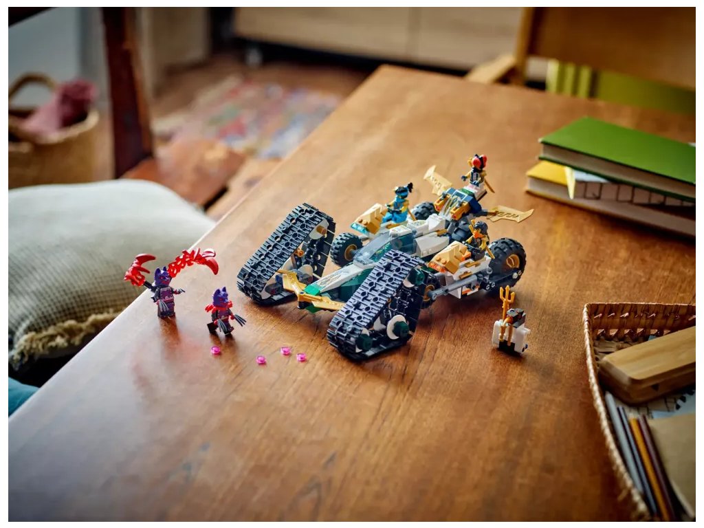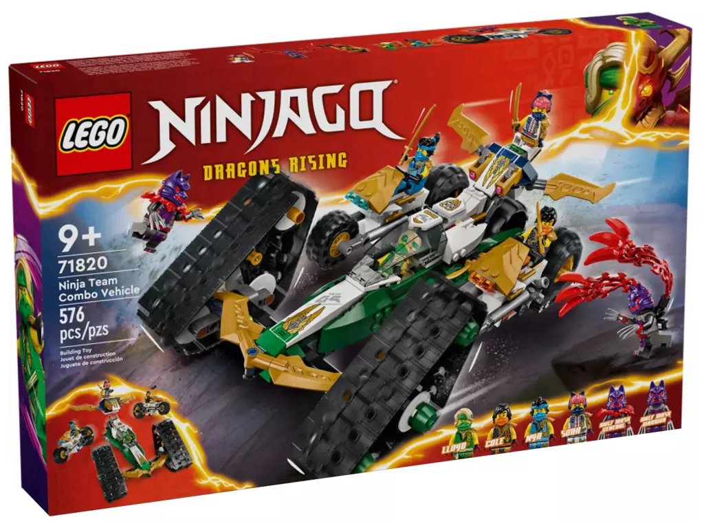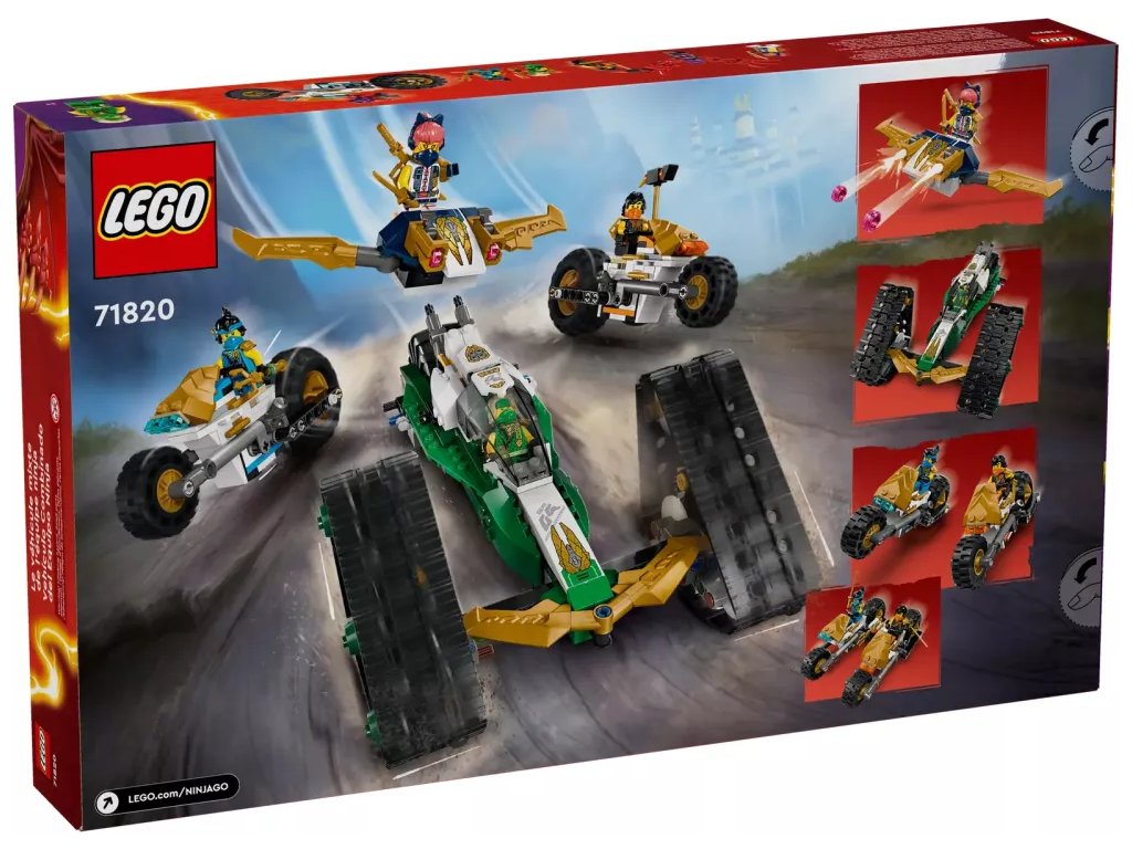 Kluci a holky od 9 let si užijí akční dobrodružství z 2. řady televizního seriálu NINJAGO® Dračí povstání se stavebnicí Tým nindžů a kombo vozidlo (71820) 4 v 1. Děti se mohou těšit na velkou porci zábavy při hraní velkým akčním modelem NINJAGO, který pak rozdělí na 4 menší vozidla: Sorin kluzák se 2 vystřelovači, Lloydův terénní závoďák a motorky Colea a Nyi.