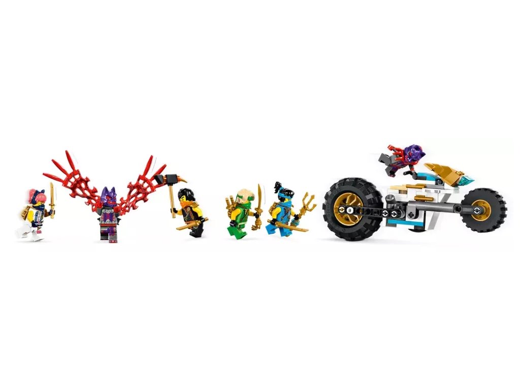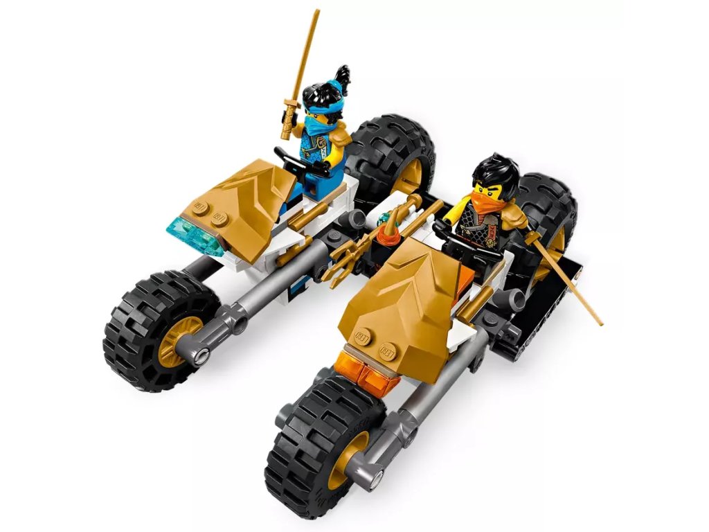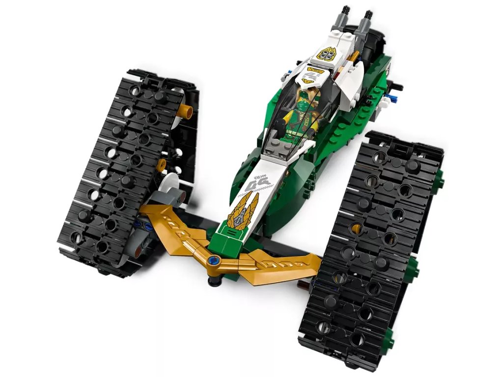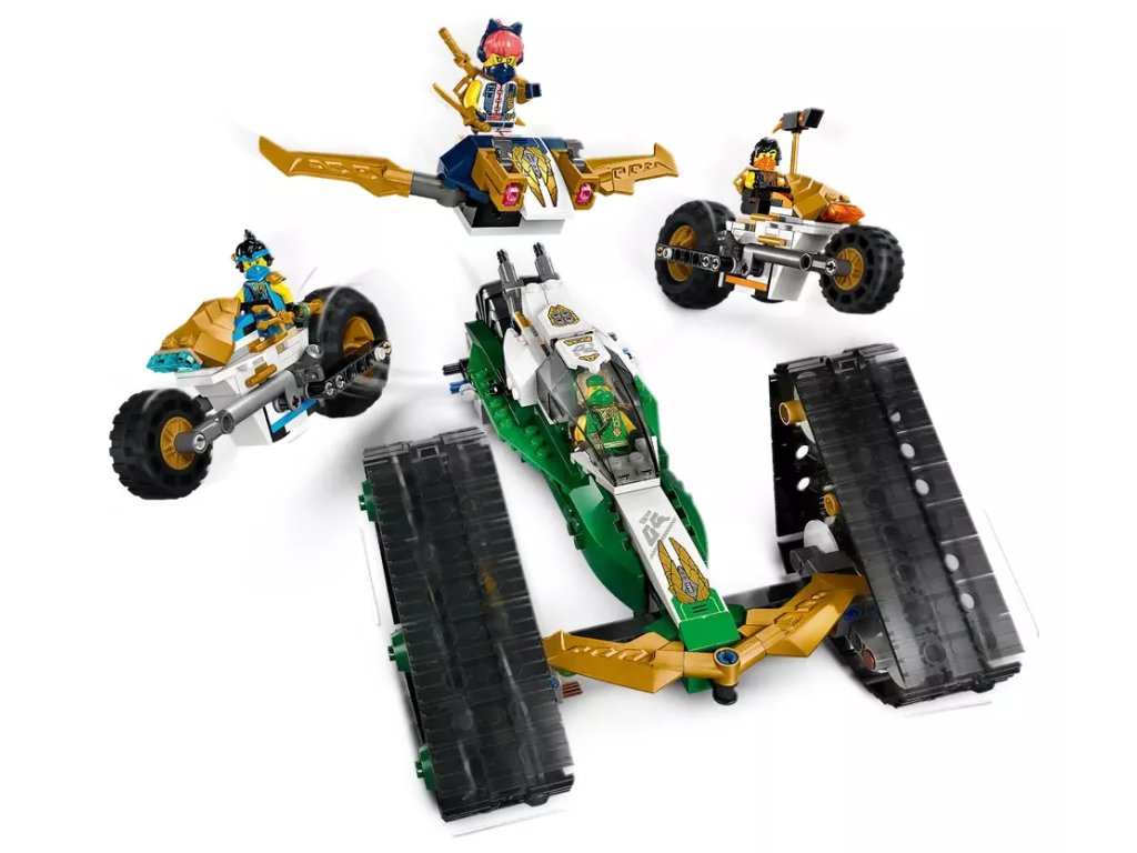 - Odnímatelná nindžovská vozidla – Velké vozidlo NINJAGO® lze rozdělit na 4 menší vozidla: Sorin kluzák se 2 vystřelovači, Lloydův terénní závoďák a motorky Colea a Nyi