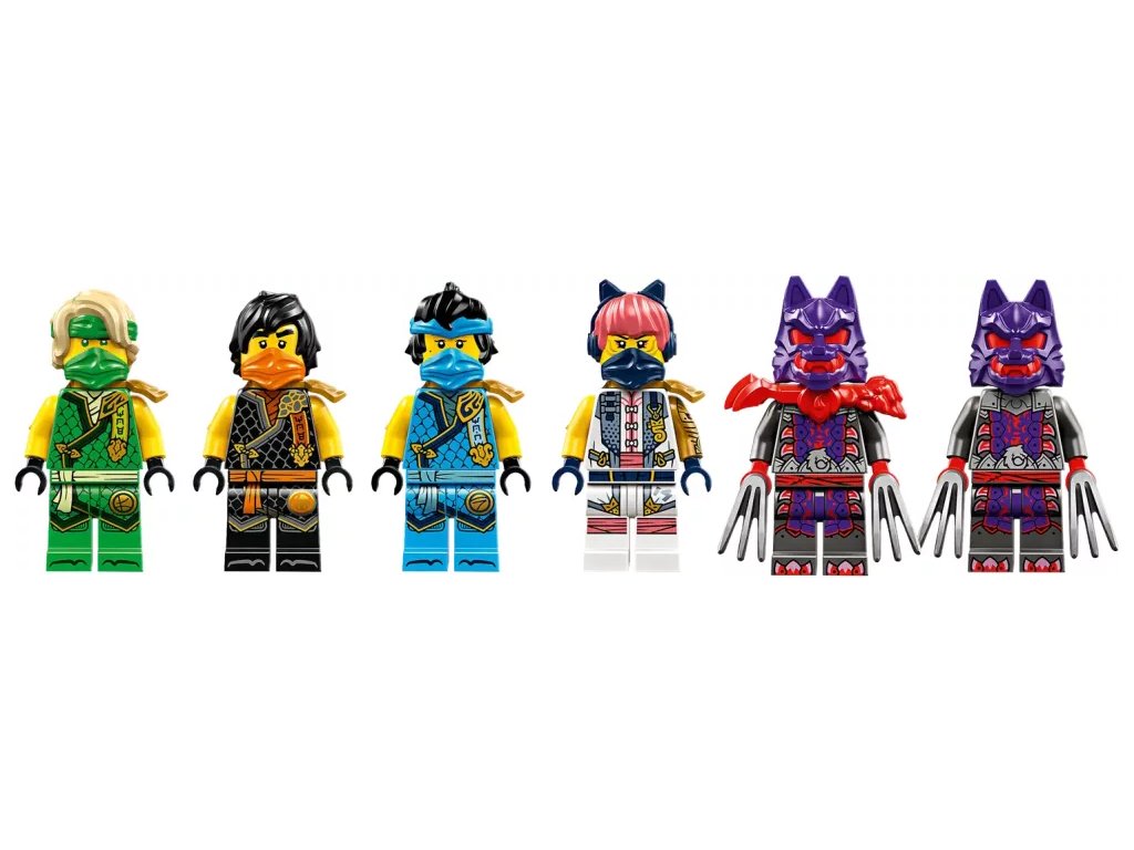- 6 minifigurek NINJAGO® – Nindžovská stavebnice obsahuje nindži Soru, Lloyda, Nyu a Colea, válečníka s vlčí maskou a generála ve vlčí masce