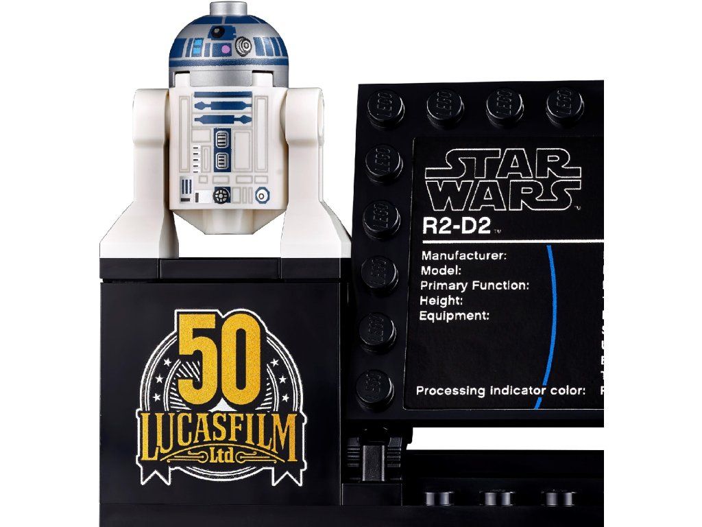 - Součástí je sestavitelný podstavec s informačním štítkem, LEGO® Star Wars™ figurkou droida R2-D2 a speciální LEGO kostkou k 50. výročí založení společnosti Lucasfilm.