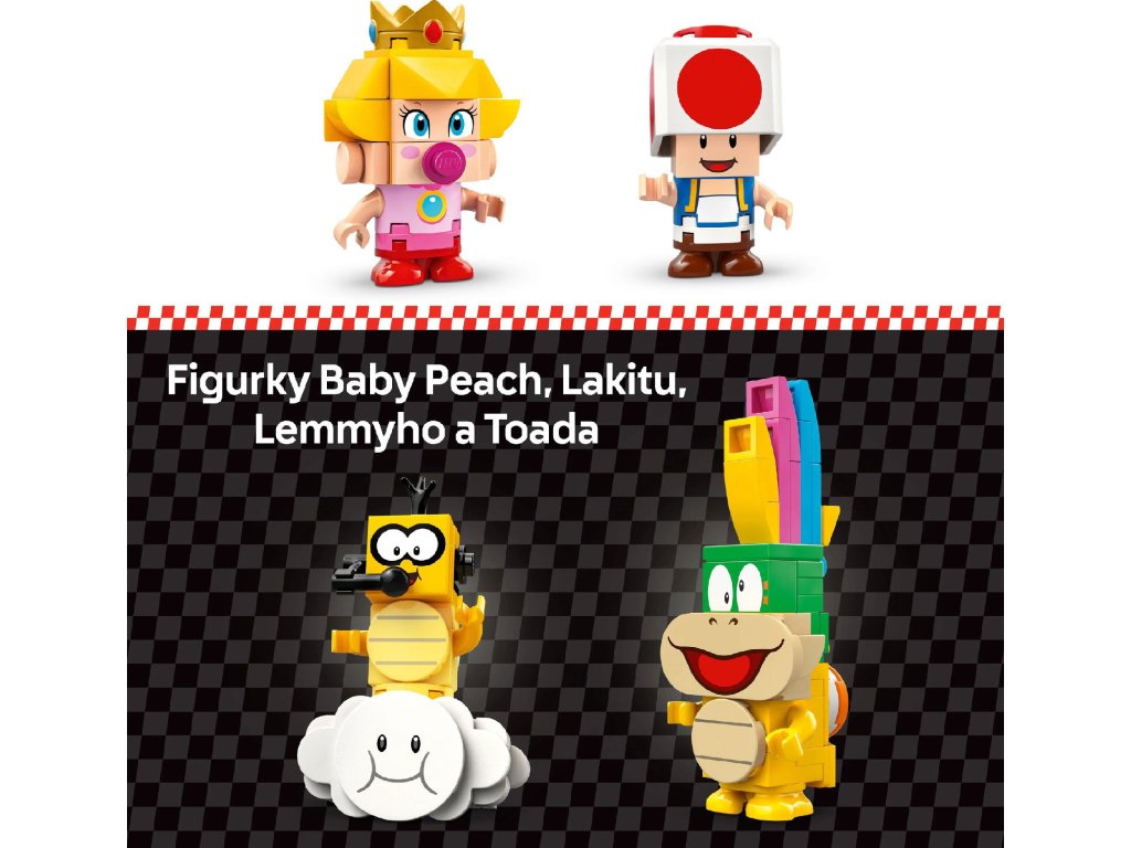 Set obsahuje figurky Baby Peach, Lakity, Lemmyho a Toada. Přidejte figurku LEGO® Mario™, LEGO® Luigi™ nebo LEGO® Peach™ (ze setů 71439, 71440 nebo 71441 – prodávají se samostatně) a užijte si interaktivní hraní s parádními digitálními reakcemi přiřízení vozidel nebo při umístění na 2 Item Boxes nebo na Akční prvky jiných modelů.